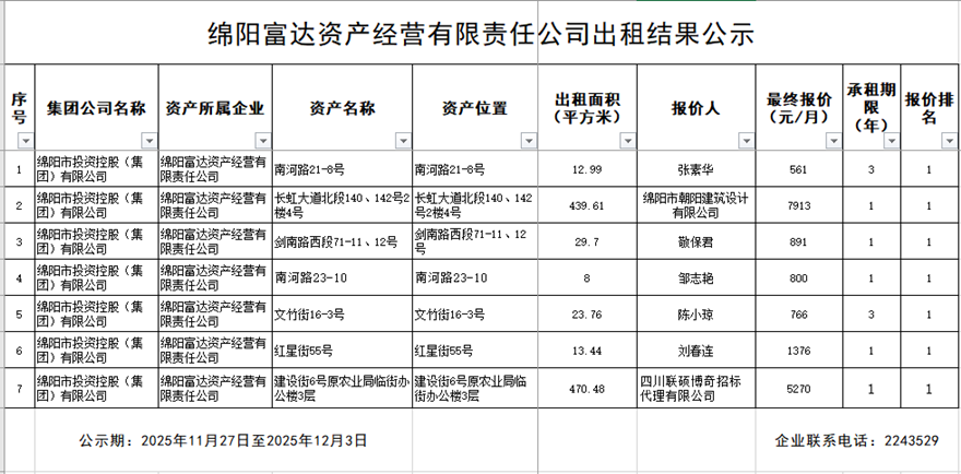 绵阳富达资产经营有限责任公司出租结果公示