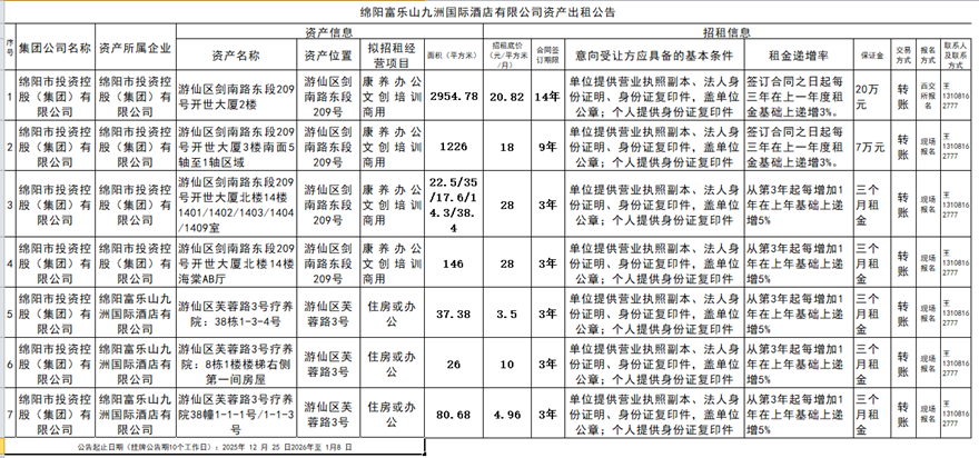 绵阳富乐山九洲国际酒店有限公司资产出租公告
