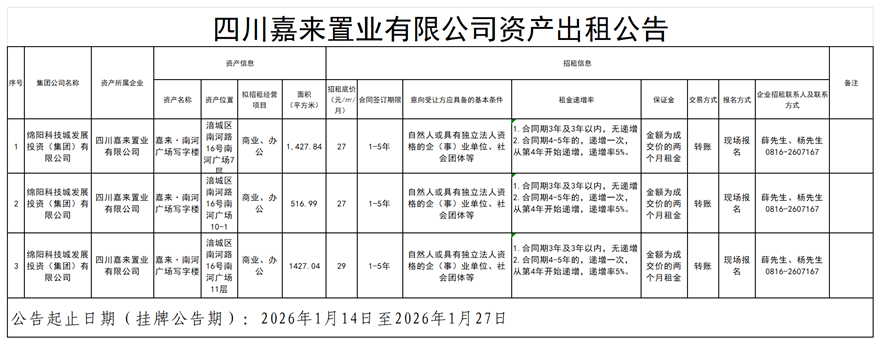 四川嘉来置业有限公司资产出租公告