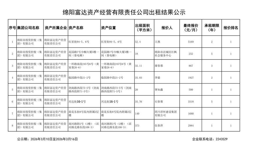 绵阳富达资产经营有限责任公司出租结果公示