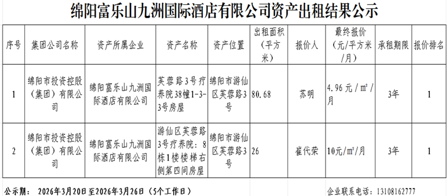 绵阳富乐山九洲国际酒店有限公司资产出租结果公示