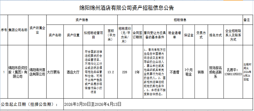 绵阳绵州酒店有限公司资产招租信息公告