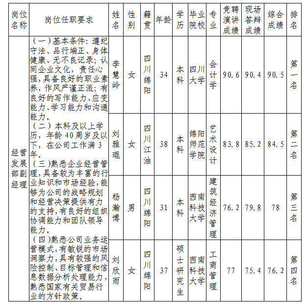 根据四川西津物有限责任公司发布的招聘公告及招聘相关规定,经竞聘演讲、现场答辩等程序,现将竞聘成绩予以公示。