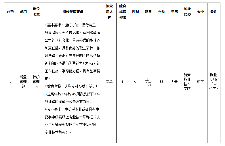 根据四川嘉来海川医疗科技有限公司发布的招聘公告及招聘相关规定,经笔试、面试、背调、体检等程序,拟录用贾琴同志到四川嘉来海川医疗科技有限公司工作,现予以公示,具体情况如下: