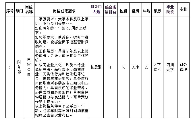 根据绵阳富乐山九洲国际酒店有限公司发布的招聘公告及招聘相关规定,经笔试、面试、背调、体检等程序,拟录用杨晨歌同志到绵阳富乐山九洲国际酒店有限公司工作,现予以公示,具体情况如下: