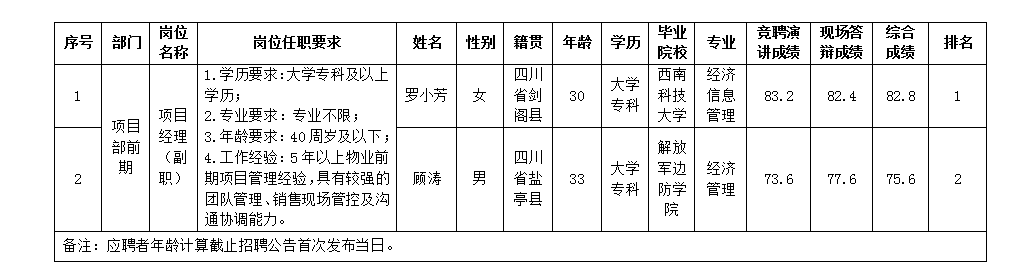 根据绵阳市绵投安和物业服务有限公司发布的招聘公告及招聘相关规定,经竞聘演讲、现场答辩等程序,现将综合成绩予以公示。