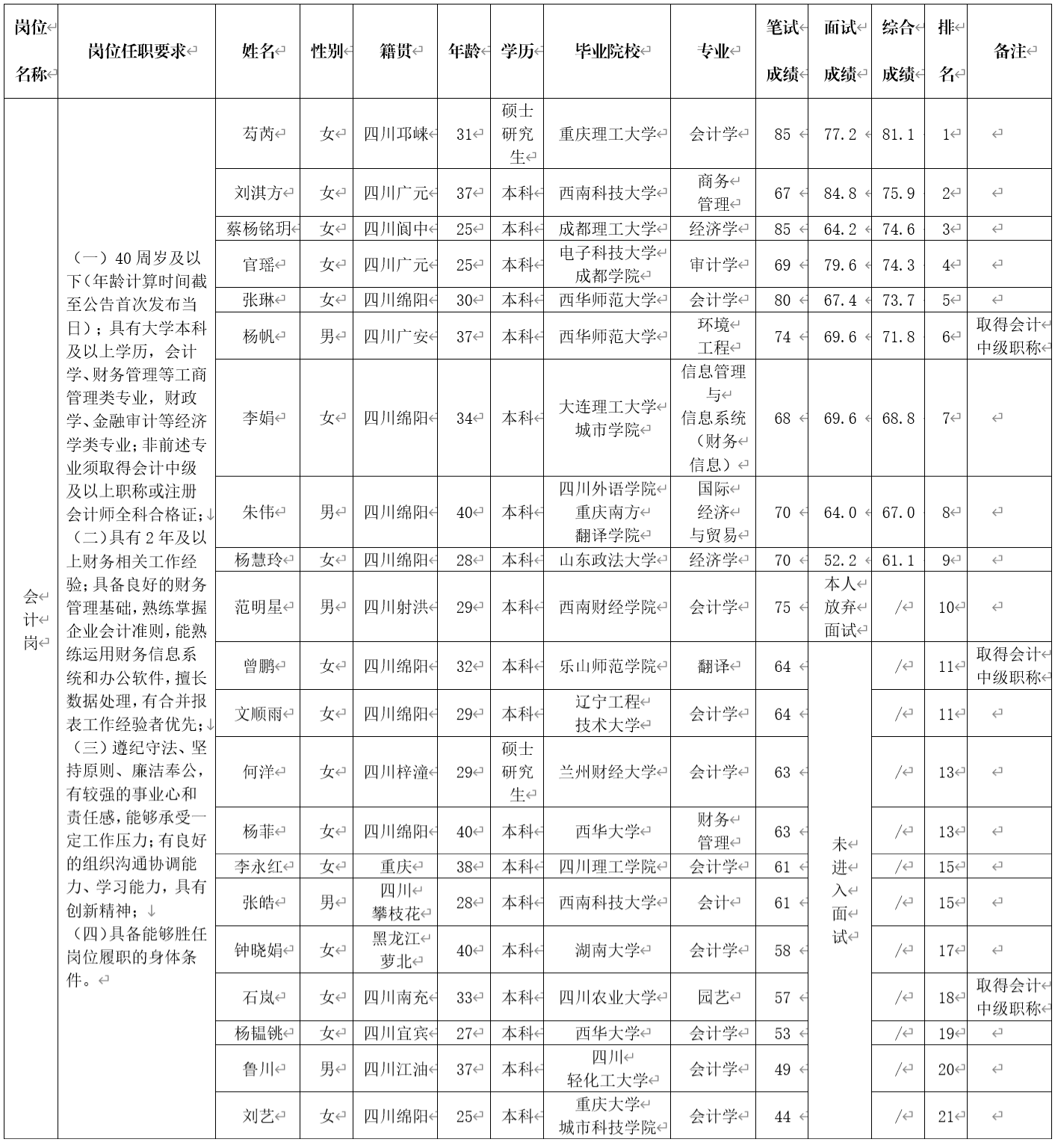 根据绵阳金控投资管理有限责任公司发布的招聘公告及招聘相关规定,经笔试、面试等程序,现将笔试(面试)成绩予以公示。