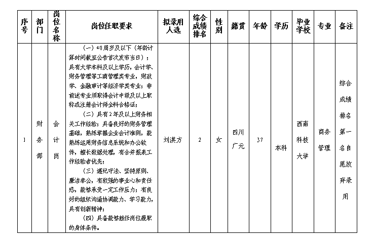 根据绵阳金控投资管理有限责任公司发布的招聘公告及招聘相关规定,经笔试、面试、背调、体检等程序,拟录用刘淇方到绵阳金控投资管理有限责任公司工作,现予以公示,具体情况如下: