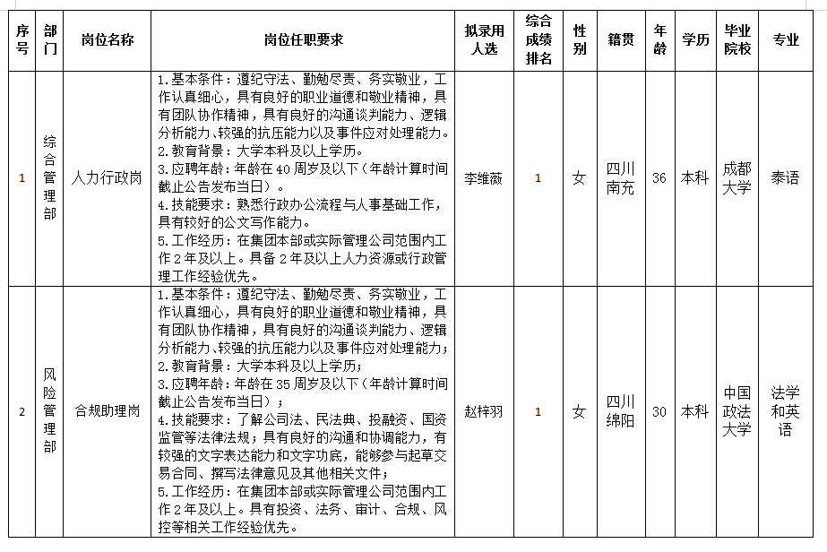 根据绵阳绵投产业投资有限公司发布的招聘公告及招聘相关规定,经笔试、面试、背调等程序,拟录用李维薇等同志到绵阳绵投产业投资有限公司工作,现予以公示,具体情况如下: