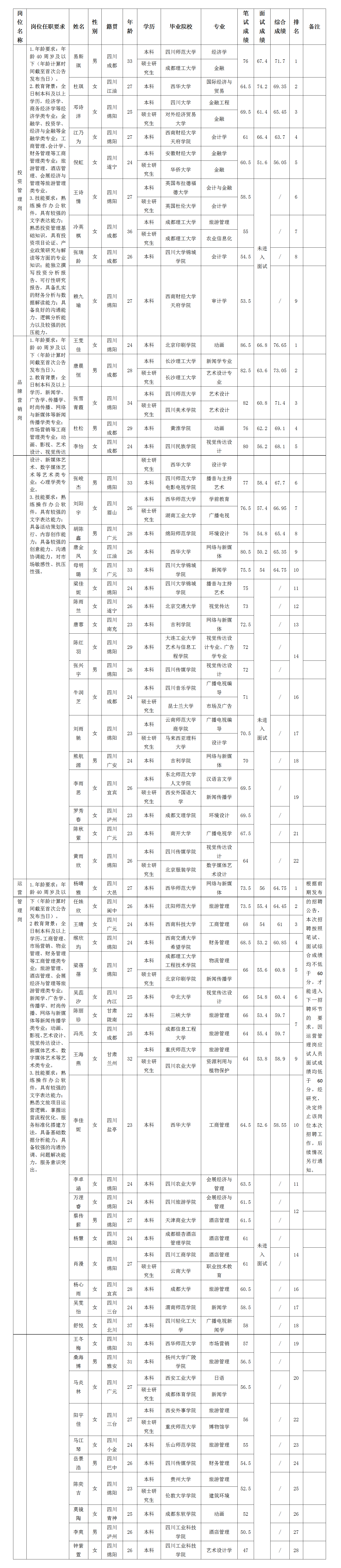根据绵阳文化旅游发展投资集团有限公司发布的招聘公告及招聘相关规定,经笔试、面试等程序,现将笔试(面试)成绩予以公示。