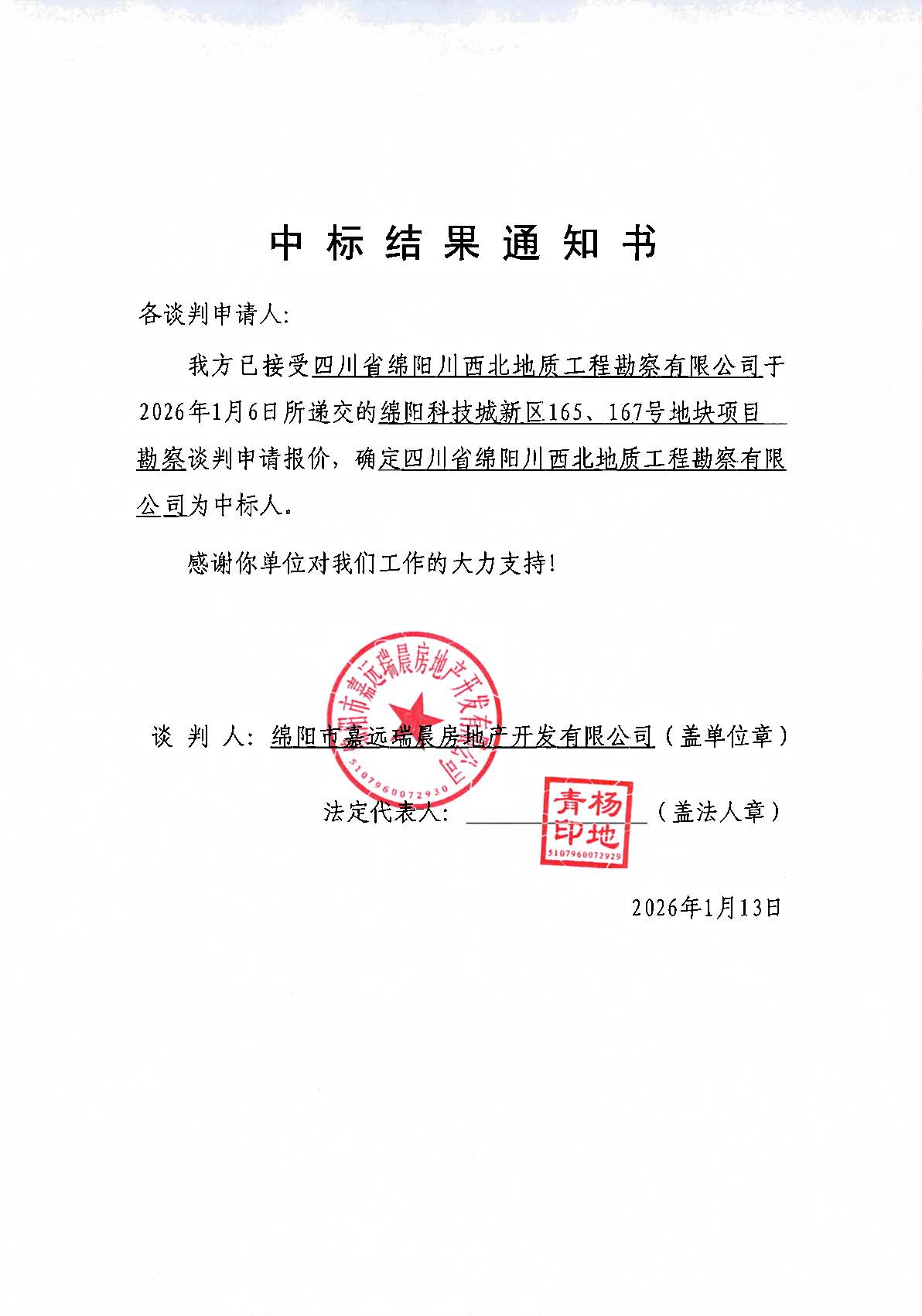 绵阳科技城新区165、167号地块项目勘察中标结果通知