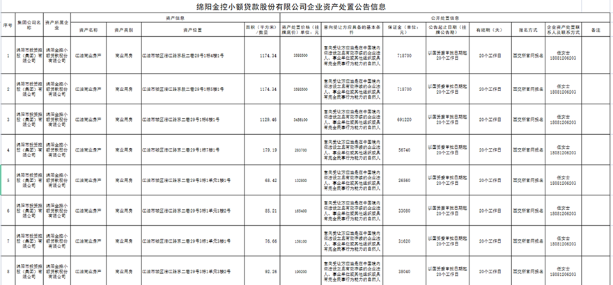绵阳金控小额贷款股份有限公司企业资产处置公告信息