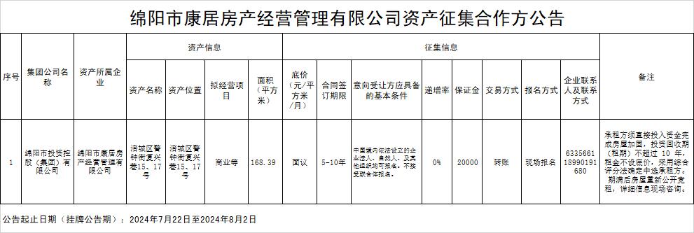 绵阳市康居房产经营管理有限公司资产征集合作方公告