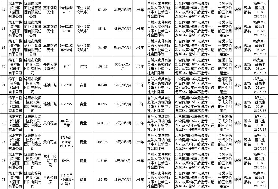 绵阳市绵投商业运营管理有限责任公司资产出租公告