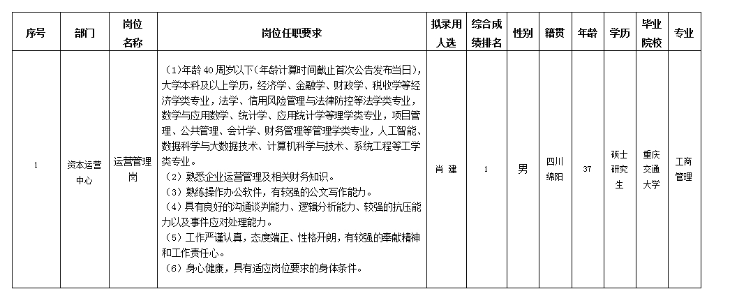 根据bat365中文官方网站官网发布的招聘公告及招聘相关规定,经笔试、面试、考察、体检等程序,拟录用肖建同志到bat365中文官方网站官网工作,现予以公示,具体情况如下: