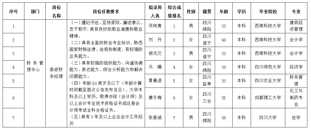 根据bat365中文官方网站官网发布的招聘公告及招聘相关规定,经笔试、面试、考察等程序,拟录用邓纯青等同志作为集团委派财务经理岗位拟录用人员,现予以公示,具体情况如下:
