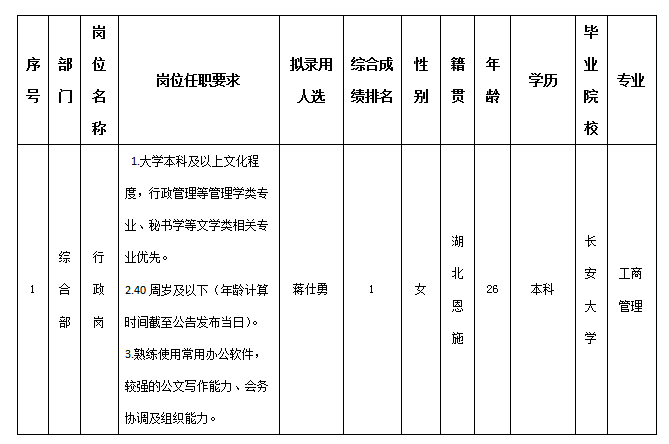 根据四川越王楼文化传播有限公司发布的招聘公告及招聘相关规定,经笔试、面试、考察、体检等程序,拟录用蒋仕勇同志到越王楼公司工作,现予以公示,具体情况如下: