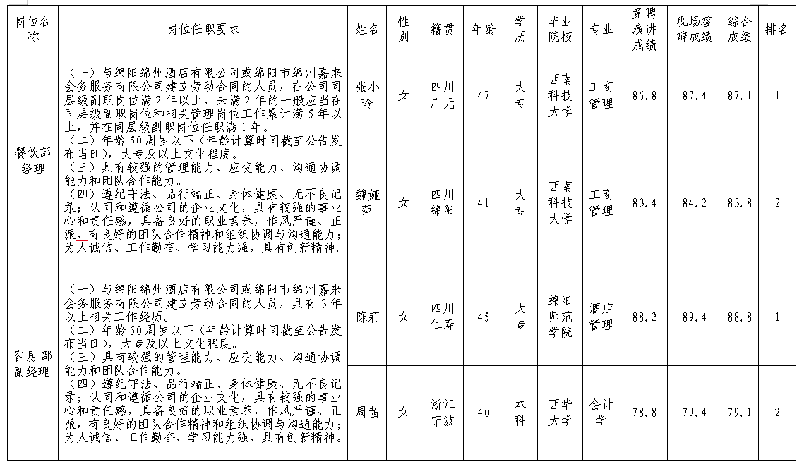 根据绵阳绵州酒店有限公司发布的招聘公告及招聘相关规定,经竞聘演讲、现场答辩等程序,现将竞聘成绩予以公示。